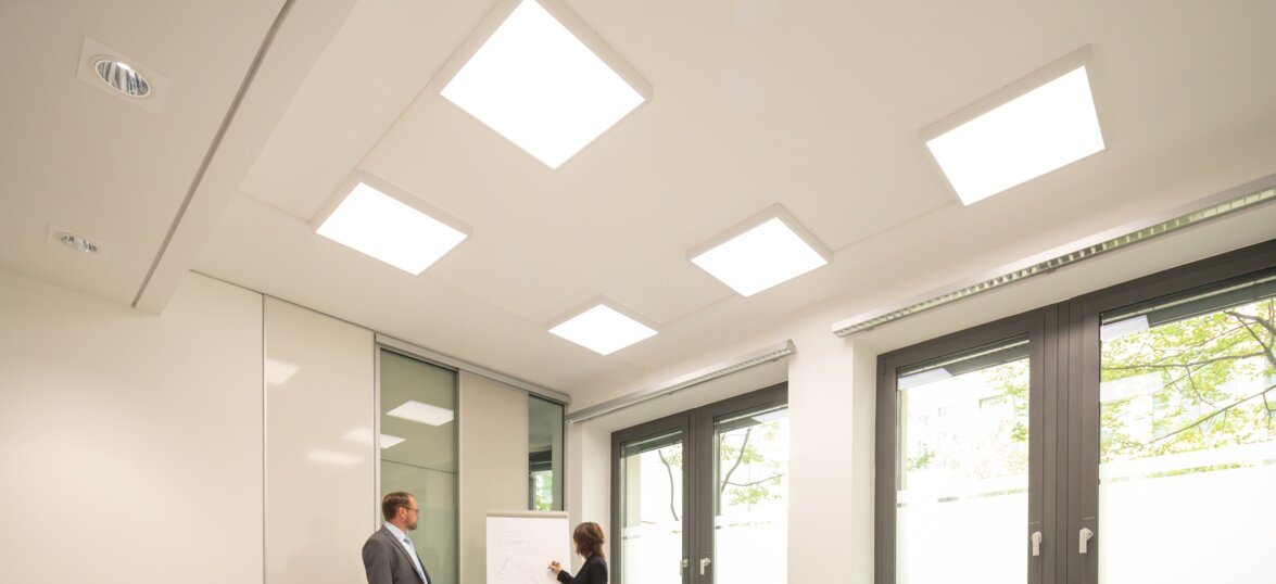 Kunden valde det innovativa BIOLUX HCL-systemet från LEDVANCE. BIOLUX HCL PANEL 625 användes, som är extremt ljus och kännetecknas av en minskad bländning på UGR < 15 och ett index med hög färgåtergivning på CRI ≥ 90. De har installerats i LEDVANCE-monteringsramar med lateral strömförsörjning i betongtaket och säkerställer en jämn ljusstyrka på 500 lux. Belysningen överensstämmer därmed med planeringsrekommendationerna för biologiskt effektivt ljus enligt DIN SPEC 67600. Skräddarsydda kåpor för runda BIOLUX HCL-downlights användes för att täcka de rektangulära takförsänkningarna på ett visuellt tilltalande sätt. HCL-systemet integrerades i kontorens rumskontrollterminaler via de intuitivt styrda BIOLUX Control Units.